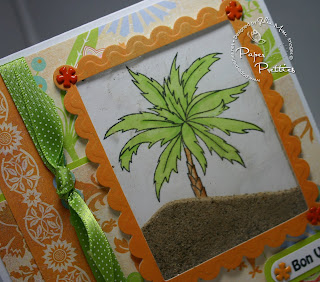 I used some fun, tropical paper from Basic Grey's Gypsy line. I thought it was summery and tropical so I decided to use the palm tree image from Soakin' Up the Sun. I used a couple of different print papers on this one, but I think it all works, right? The 2 strips are from a sheet of strips - it looks better IRL, you can see the break in the patterns better.